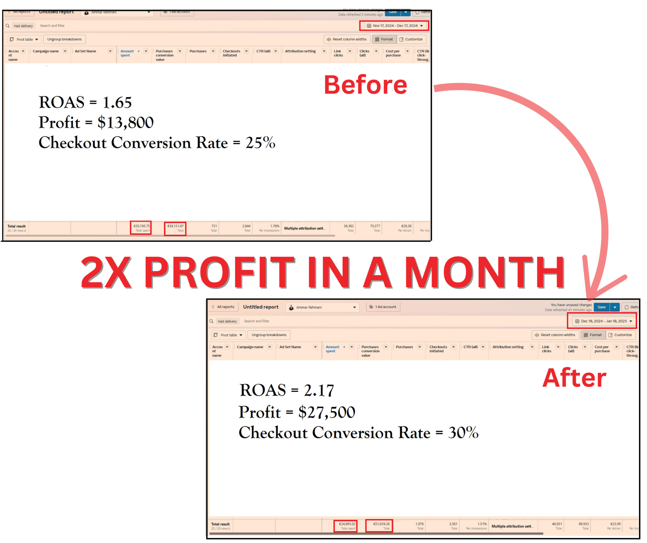Checkout conversions rose from 25% to 30% and profit doubled within 30 days